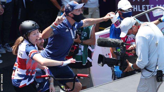+ team great britain pose for a photo together after the bmx freestyle on day nine of the.